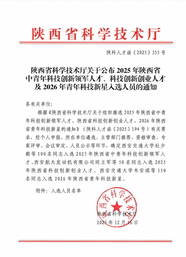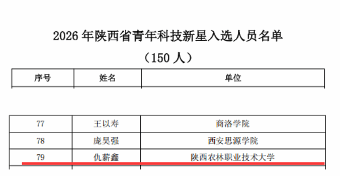 12月16日,陕西省科学技术厅正式发布了《关于公布2025年陕西省中青年科技创新领军人才、科技创新创业人才及2026年青年科技新星入选人员的通知》。喜讯传来,我院教师仇薪鑫凭借其卓越的科研能力和创新精神,成功入选2026年陕西省青年科技新星。此次全省共有150名优秀同志入选青年科技新星,仇薪鑫副教授作为我院杰出青年教师代表,在众多申报者中崭露头角,脱颖而出。