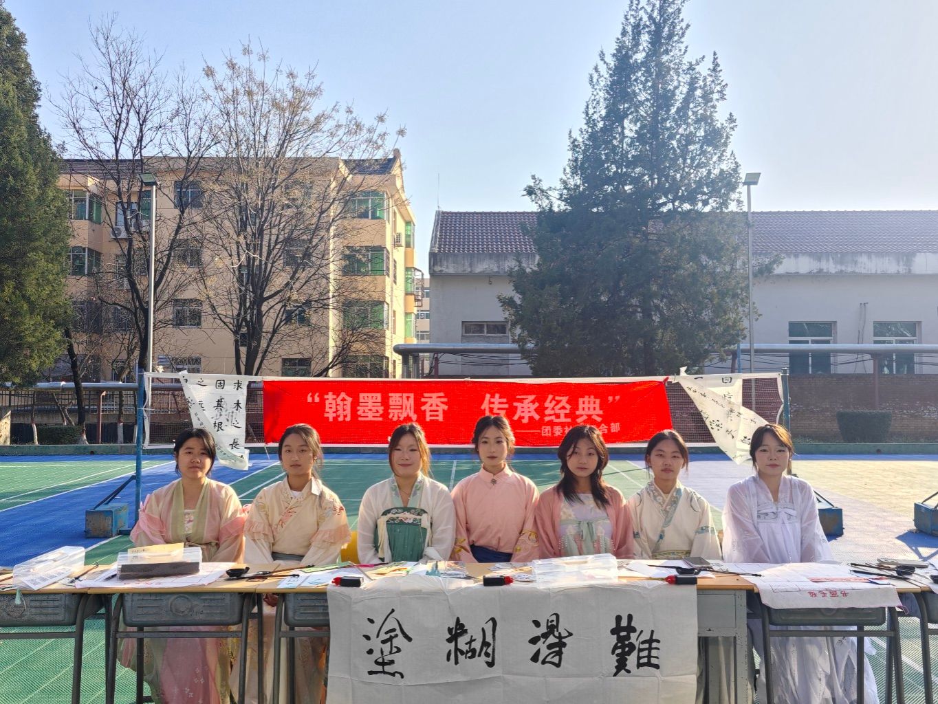 一横一竖,藏亘古风骨;一撇一捺,写时代新篇。2025年12月15日,一个阳光和煦的午后,陕西农林职业技术大学北校区羽毛球场内,墨香袅袅,笑语盈盈。由动物工程学院墨涵书法社倾情主办的“翰墨飘香,传承经典”书法主题活动,在此化身为一座流动的古典艺术馆,吸引了众多学子驻足流连,共赴一场与千年翰墨的浪漫之约。