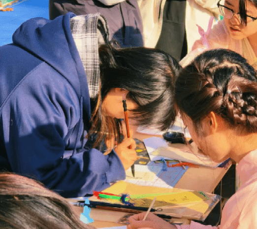 整个下午人气最旺的,莫过于 “墨创·随心”创意小书签制作区。这里备有各式精美的空白书签和齐全的文房用具。同学们在社团志愿者的指导下,纷纷执笔尝试。有的专注临摹古帖,体会先人笔法;有的则自由创作,写下属于自己的座右铭或祝福语。身着汉服的志愿者穿梭其间,从执笔姿势到运笔技巧,给予细致点拨。这一刻,无关技艺高低,唯有全心沉浸于笔墨世界的宁静与喜悦。一枚枚亲手完成的小书签,不仅是独特的活动纪念,更成为了承载个人心意与文化韵味的玲珑艺术品。
