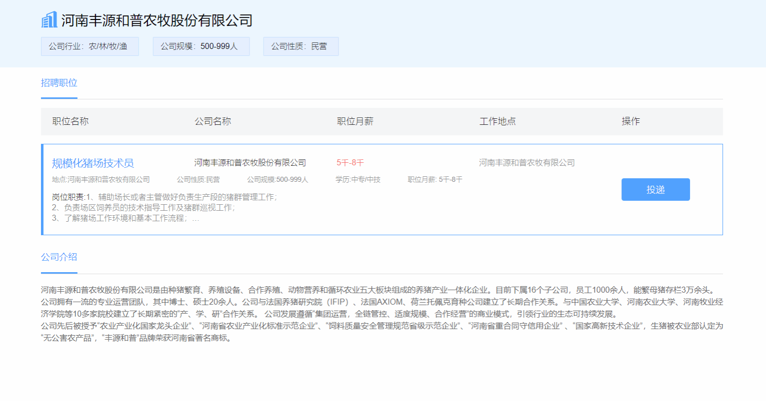 河南丰源和普农牧股份有限公司招聘规模化猪场技术员
