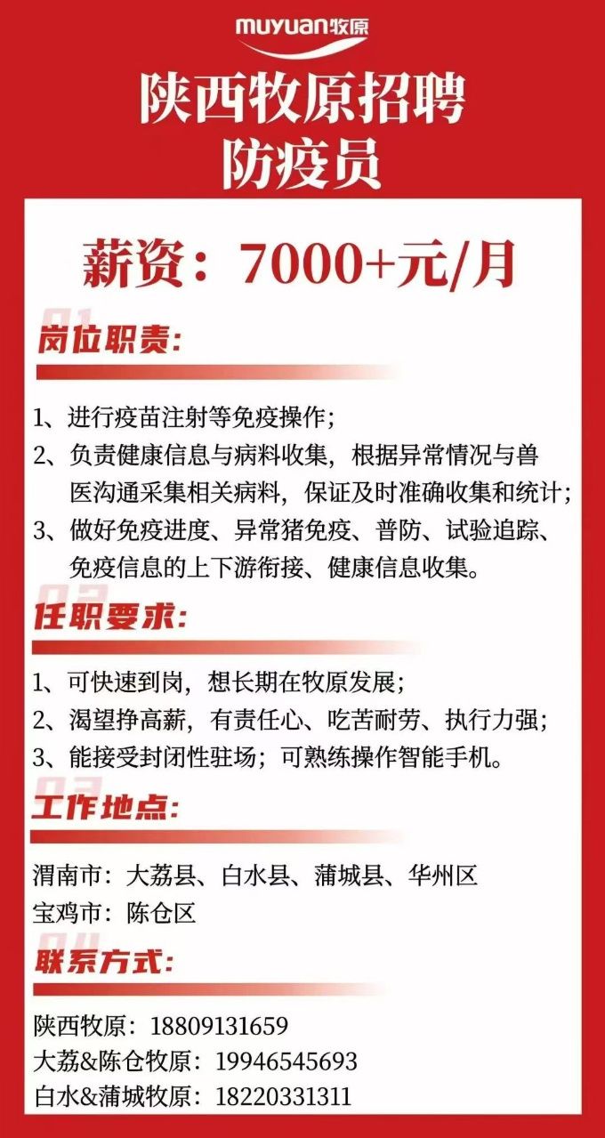 陕西牧原招聘防疫员