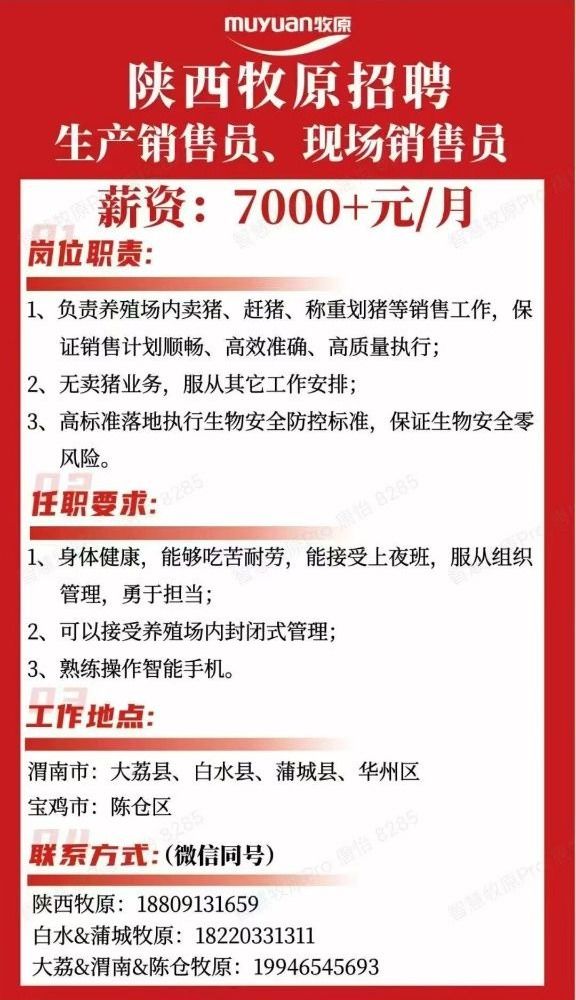陕西牧原招聘生产销售员、现场销售员
