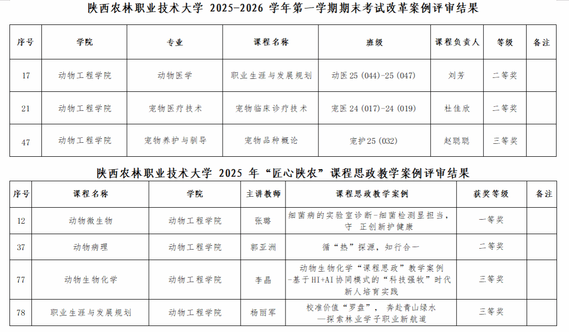 近日,学校发文公布了2025-2026学年第一学期期末考试改革案例评审结果,以及2025年“匠心陕农”课程思政教学案例评审结果。我院凭借扎实的教学改革实践与创新探索,在课程建设领域收获满满,成果斐然。