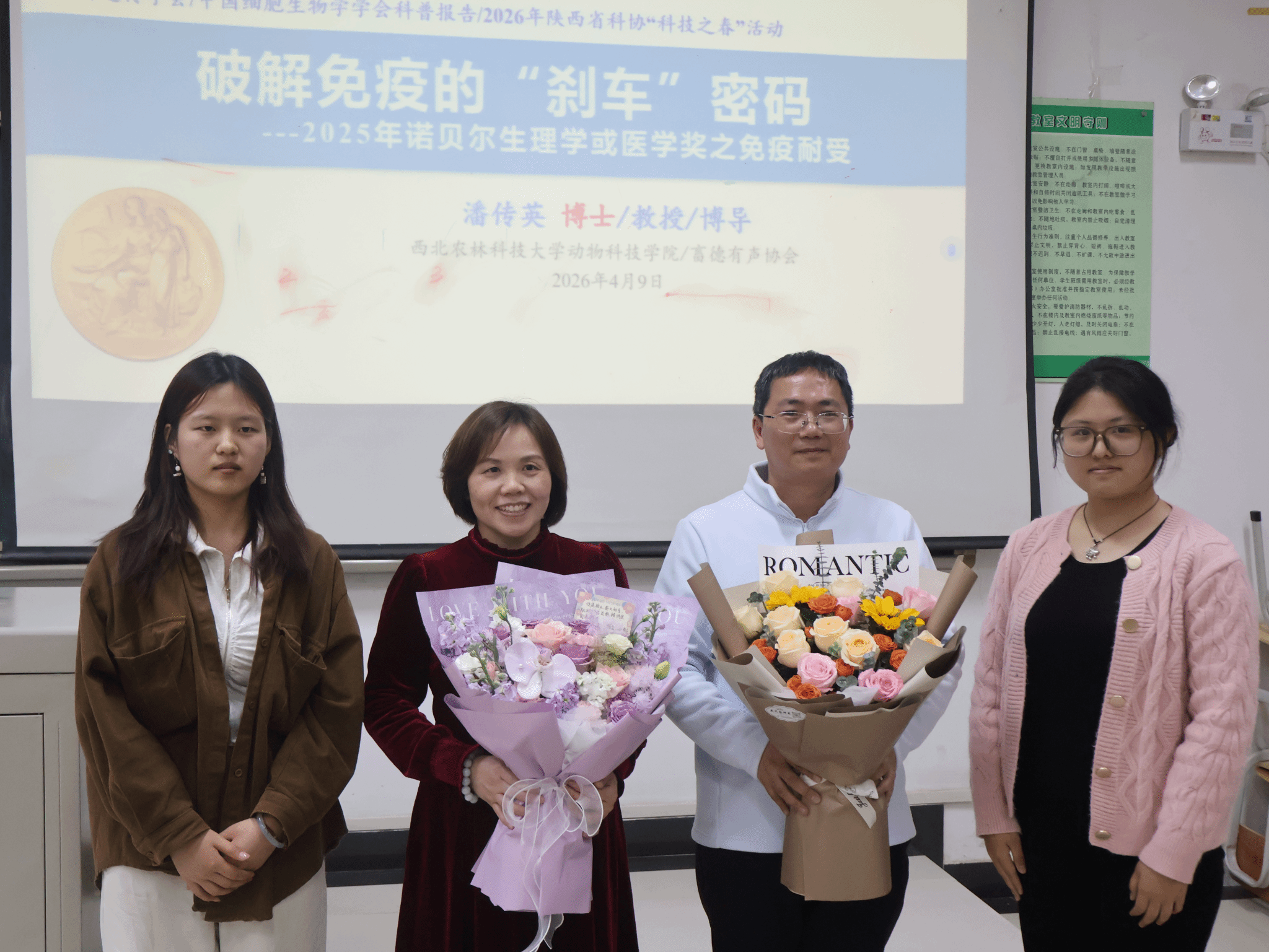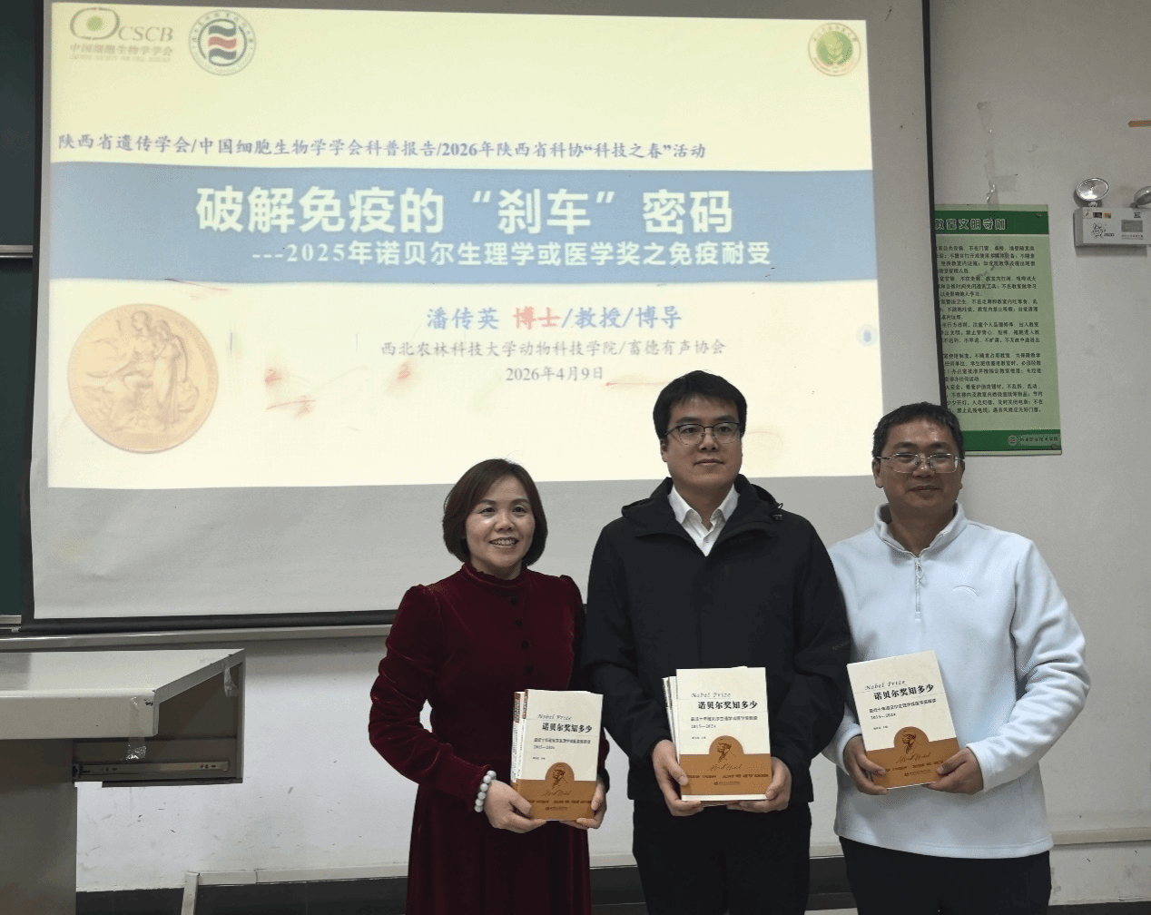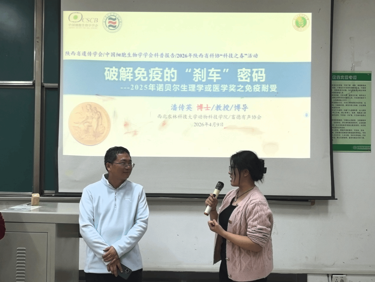 为了激发动物医学专业本科生科学探索的热情,解码诺奖奥妙,掌握免疫领域的关键知识,4月9日,学院邀请西北农林科技大学动物科技学院博士生导师潘传英教授、蓝贤勇教授,以《破解免疫的“刹车”密码---2025年诺贝尔生理学或医学奖之免疫耐受》为题作科普讲座,并为学院赠送《诺贝尔奖知多少:最近十年诺贝尔生理学或医学奖解读(2015—2024)》。2025级动物医学专业本科生、教师代表90余人参加此次活动。