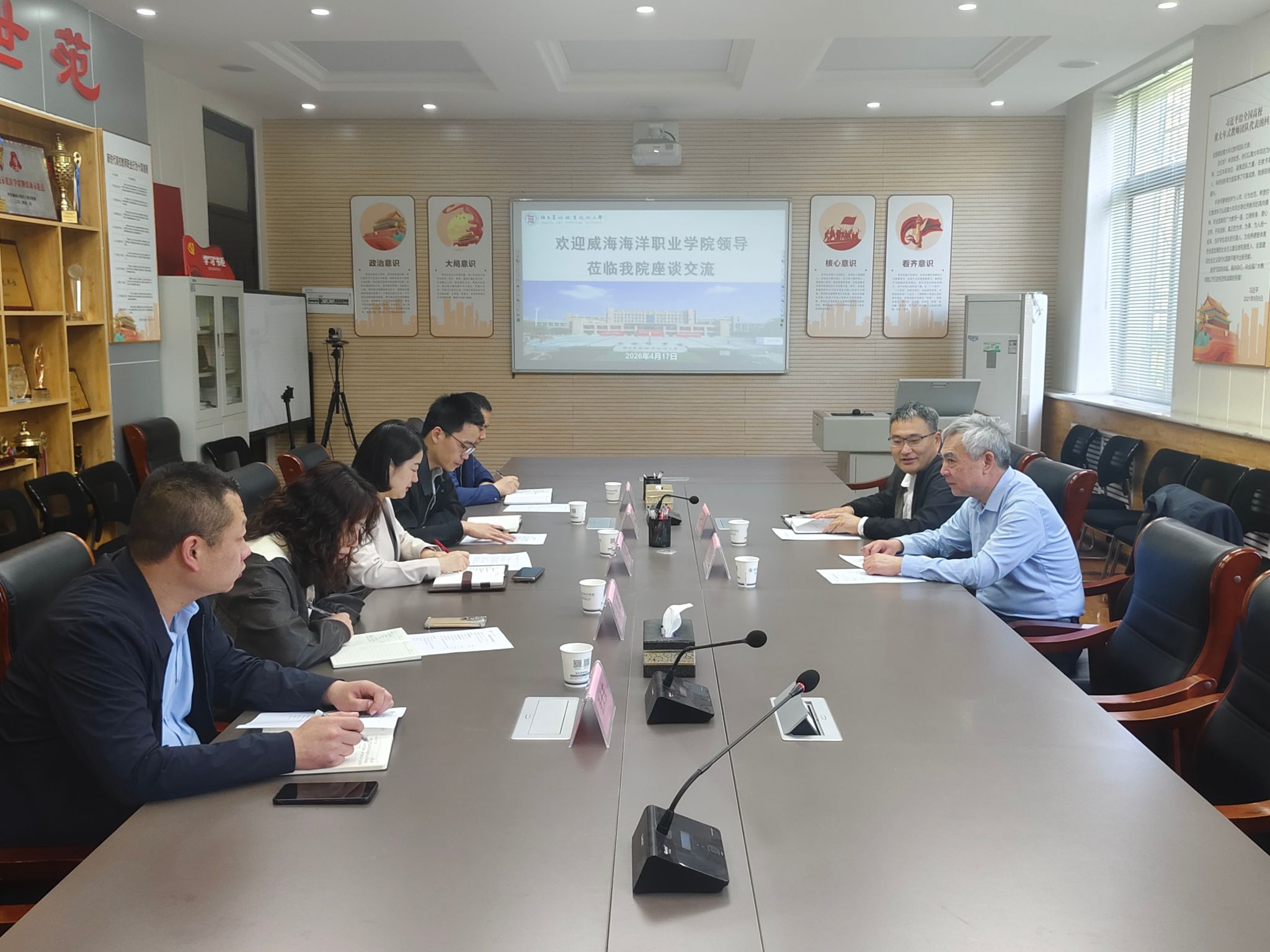 4月17日上午,威海海洋职业学院学术委员会主任、教授刘振华、海洋生物系主任、教授侯仕营一行莅临我院座谈交流。我院院长助理贾燕青、实训科副科长王斌、动物养殖教研室主任任建存、动物医学教研室副主任张璐、挂职干部、西安海棠职业学院学生处副处长、现代技术系副主任张长东参加了座谈会。