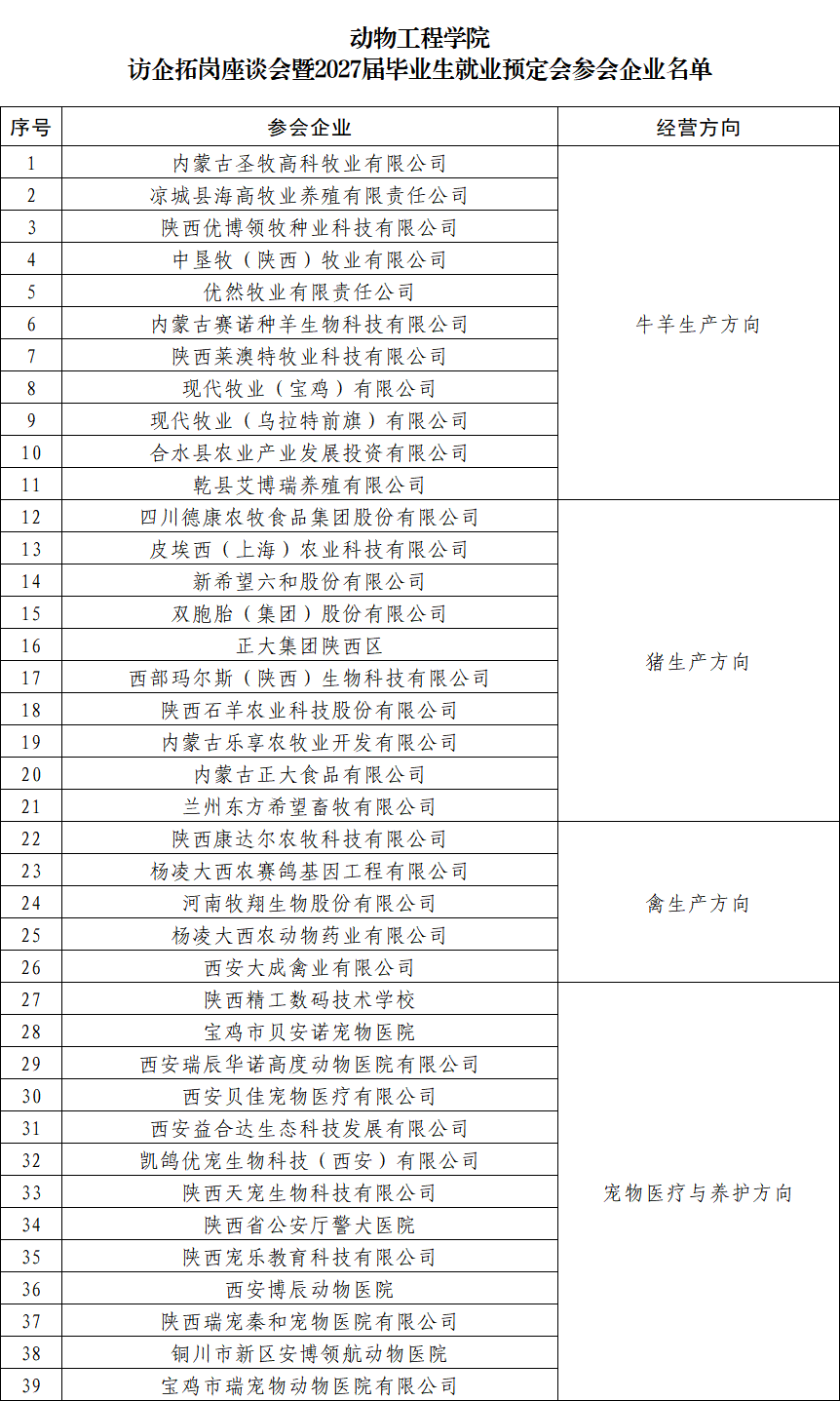 为贯彻落实学校关于毕业生就业工作的安排部署,搭建校企精准对接平台,促进我校毕业生高质量充分就业。4月20日,动物工程学院邀请39家行业知名企业召开访企拓岗座谈会暨2027届毕业生就业预定会。学院领导班子成员、各教研室主任、专业带头人和相关企业代表等参加了座谈。
